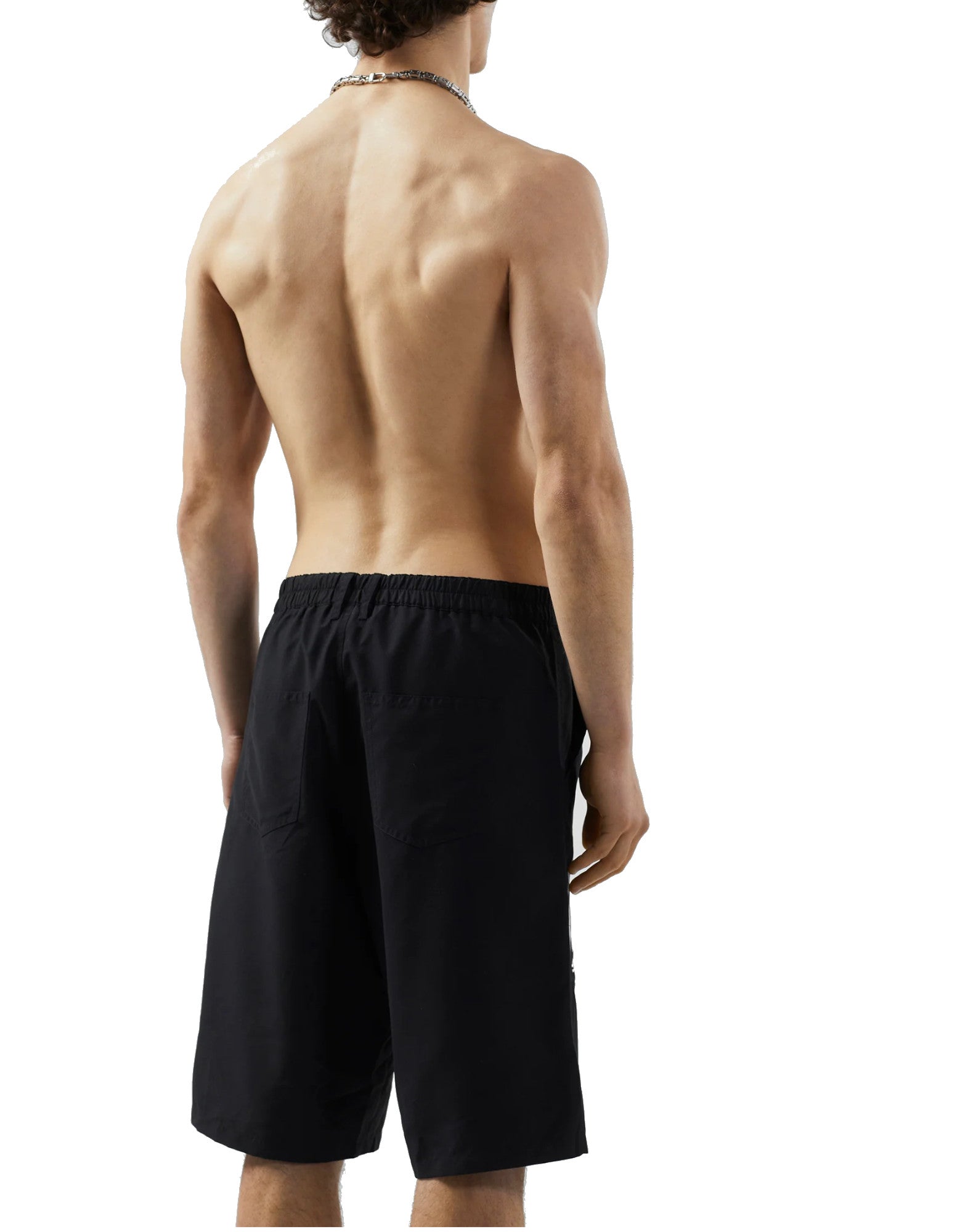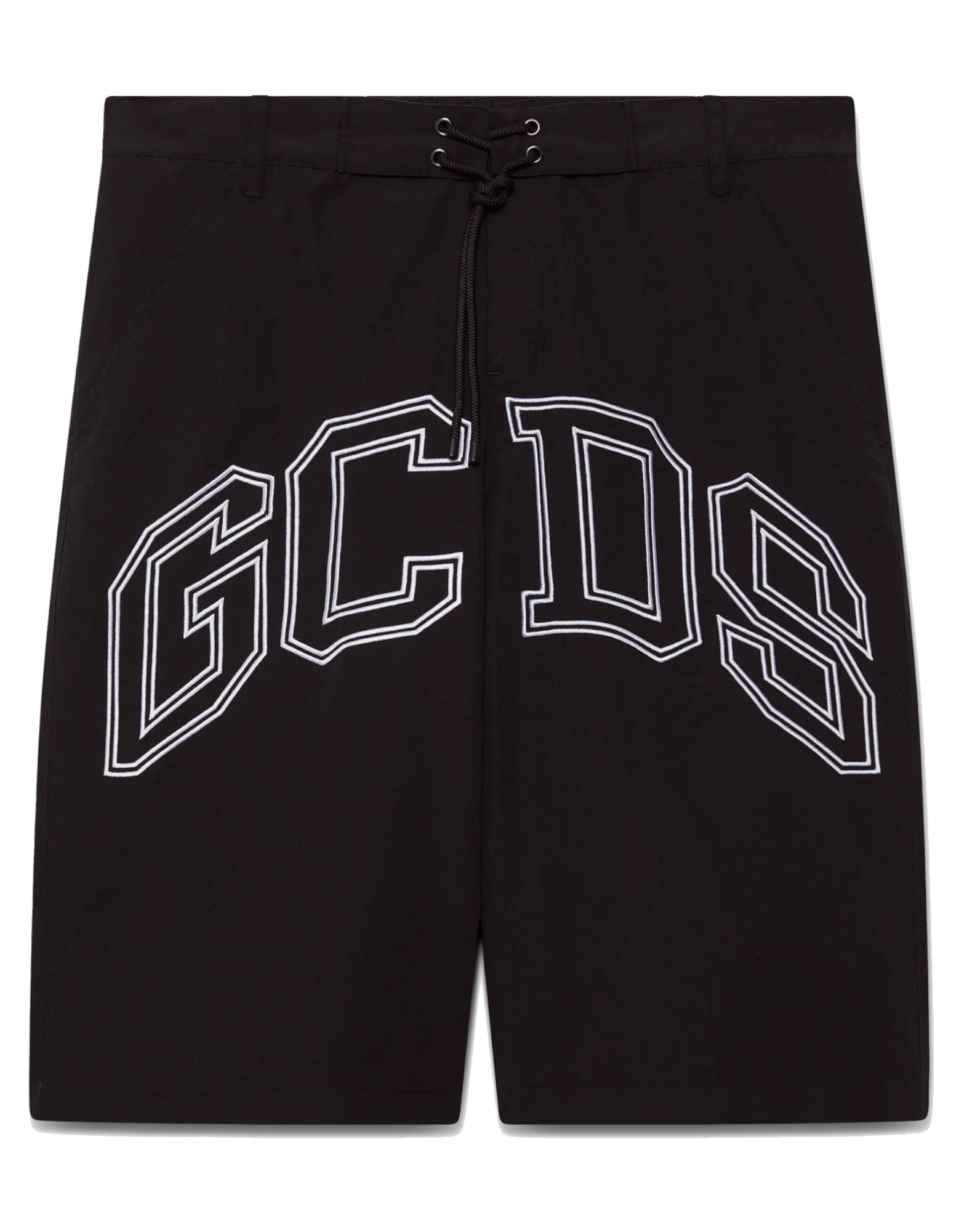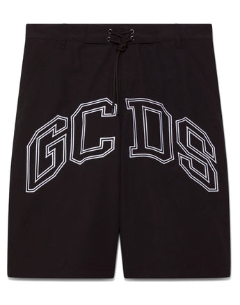 GCDS ESSENTIALS BOXER DA MARE BLACK CON LOGO GCDS LOUNGE NELLA PARTE ANTERIORE. VITA ELASTICIZZATA REGOLABILE CON LACCETTI.