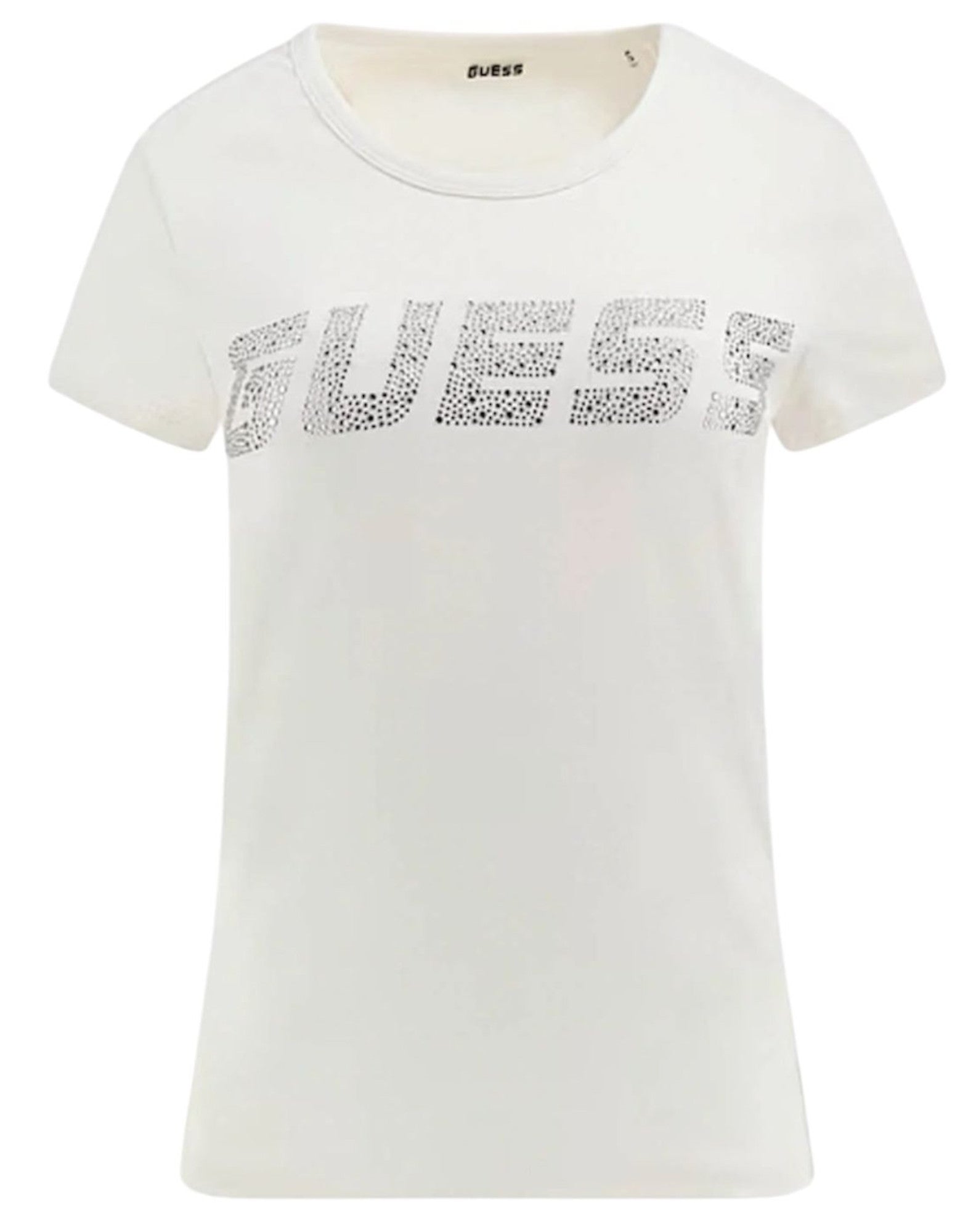 GUESS T-SHIRT KIARA BIANCA CON STRASS. T-SHIRT GIROCOLLO IN STRETCH DI COTONE A MANICHE CORTE. LOGO LETTERING IN STRASS NELLA PARTE FRONTALE. VESTIBILITA^ SLIM.
